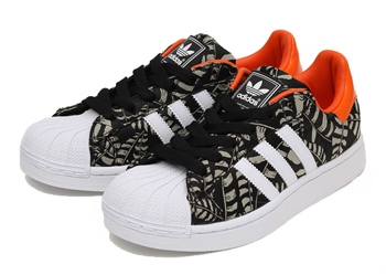 ┗adidas【アディダス】オリジナルスの2013年FALLシーズンモデル。adidasといえば、このシューズ『スーパースター』と言っても過言ではないほど、定番中の定番といえる人気スニーカー。元々は1970年代にNBA選手たちに愛用されたことから一躍注目を集め、ストリートへ波及していったモデルです。デザインの特徴として、シェル型のゴムのトゥキャップにサイドのスリーストライプ。スタンスミスと並ぶ、アディダスの大黒柱の一つ。今回のモデルは、アッパーにサテン調のジャガードフェザーのグラフィックをあしらったデザインを採用したガールズモデル。