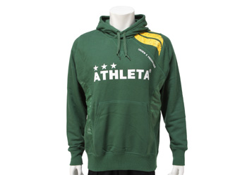 ┗フットサルブランドの中で不動の地位を確立しつつあるアスレタ。こちらは2012年秋冬モデルのスウェットパーカーです。もはやお馴染みのカフェブラロゴが左肩から背中にかけてカスレプリントで描かれたデザイン。肌触りが良く保温性に優れるスウェットの素材を使用。両脇部分には防風性に高い素材を使用。カジュアル使いでも人気の高いウェアです。