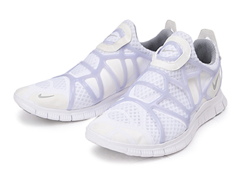 ┗NSW(NIKE SPORTSWEAR)の2013年SUMMERシーズンモデル。伸縮素材のテキスタイルアッパーを、かごのようなデザインのTPU素材で包みこんだ独特のデザインで一世風靡し、ストリートでも一大ブームを巻き起こした・エア クキニからインスパイアを受けたカジュアルモデル。快適性を求めたスリッポンスタイルに、ナイキを代表するテクノロジーにまで成長を遂げたナチュラルランニングコンセプトのナイキ フリーの5.0ソールを融合させたハイブリッドスニーカーがABC-MART限定として登場。
