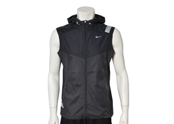 ┗NIKE RUNNING【ナイキランニング】の2013年SUMMERシーズンモデル。サイドパネルにパーフォレーションウーブン素材を使用し、通気性を確保したフード付きランニングベスト。左肩と右裾部に再帰反射プリント。左胸に再帰反射スウッシュロゴプリント。