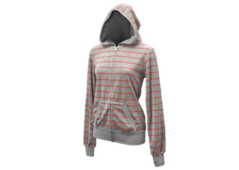 ┗NIKE【ナイキ】のレディースフルジップパーカー。2011年FALLシーズンモデル。肌触りの良いベロア素材を使用。細めのボーダー柄が女性らしく可愛いデザイン。