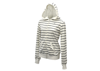 ┗NIKE【ナイキ】のレディースフルジップパーカー。2011年FALLシーズンモデル。肌触りの良いベロア素材を使用。細めのボーダー柄が女性らしく可愛いデザイン。